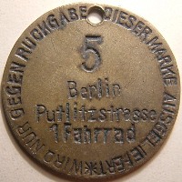 germ 3073 H | wird nur gegen ruckgabe dieser marke ausgeliefert / (number)(incuse) / berlin(incuse / putlitzstr.(incuse) / 1 fahrrad | (circle of dots) | Germany | Berlin | Z | 40.2 | Hole | |