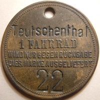 germ 3864 A | teutschenthal(incuse) / 1 fahrrad / wird nur gegen ruckgabe / dies. marke ausgeliefert / (number incuse) | (blank) | Germany | Teutschenthal | B | 40.5 | Hole | |