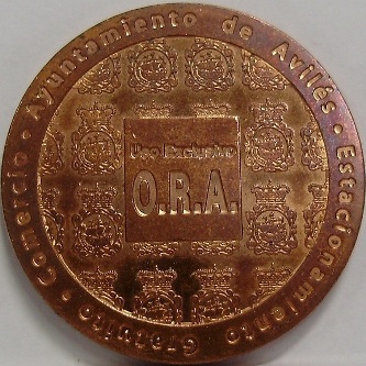 spai 3050 A | ayuntamiento de Avilés . estacionamiento gratuito . comercio . / uso exclusivo / O.R.A. (city arms)(all incuse) | ayuntamiento de Avilés . estacionamiento gratuito . comercio . / uso exclusivo / O.R.A. (city arms)(all incuse) | Spain | Avilés | Bz/S | 28.0 | Sd | |