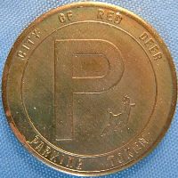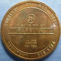 cana ab 3800 A | city of red deer / p / parking token (deer) | courtesy of red deer / 25c / in service only for / parking / in the / city of / red deer / downtown business | Canada | Red Deer | B | 23.9 | Sd | |