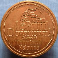 cana bc 3435 C | get / a round / downtown! / courtesy of / downtown kelowna | this token / redeemeble for / 25c / on downtown / parking / lm (logo) | Canada | Kelowna | B | 25.1 | Sd | |